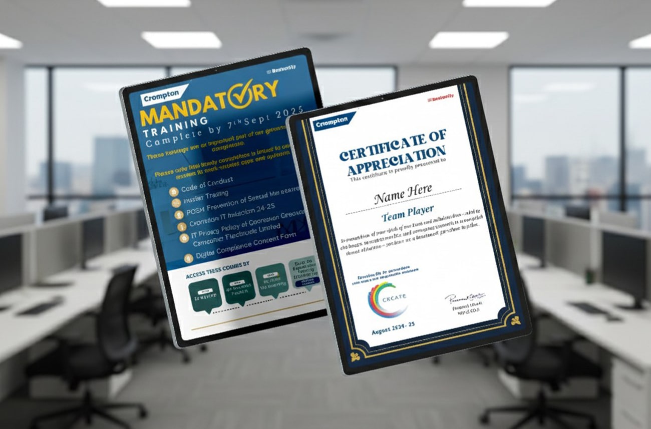 Modern emailer designs for internal and external communication Impactful posters and marketing materials Logo and visual support for sub‑brands and initiatives Fast turnaround with consistent visual standards A noticeable uplift in Crompton’s communication quality — clean, bold, and effective